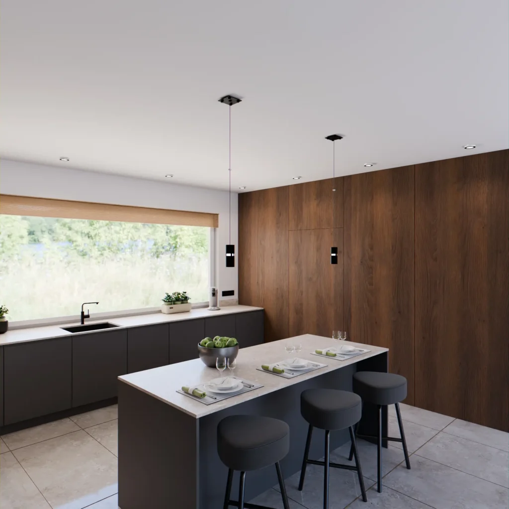 🔹 Kuchnie nowoczesne – proste linie, szafki bezuchwytowe, czarne i metalowe akcenty.